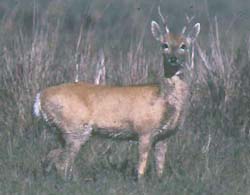 Se trata de un ciervo de tamaño mediano, cubierto por un pelaje corto y liso, con un remolino en la cruz y en la base del cuello. El color predominante del pelo es bayo claro o pardo-amarillento, como mejor se interprete, en todo el cuerpo salvo en la zona ventral, la cara inferior del cuello, la porción ventral de la cola, la parte posterior de los muslos, la zona interna de la orejas, el área periocular, los bordes del labio superior y el extremo de la mandíbula, que son de un blanco puro. La porción dorsal de la cola puede presentar una mancha parda o negruzca. Los tonos varían tanto dentro de una misma población como en las diferentes razas o subespecies.